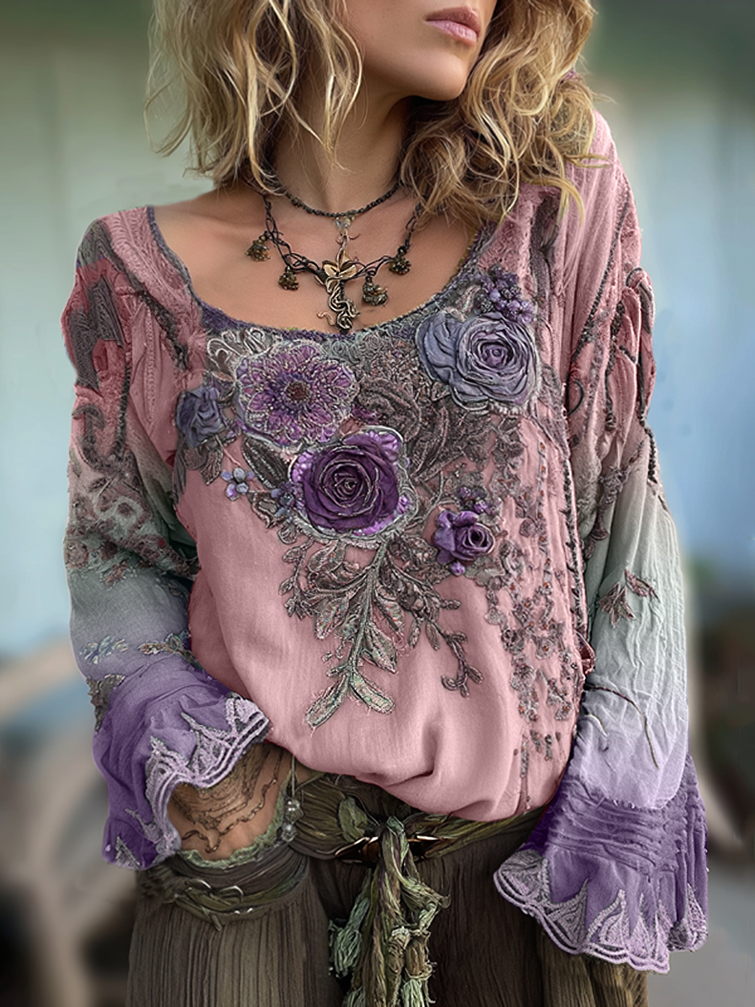 Vintage Purple Lavender And Floral Embroidered Linen Long Sleeve Shirt